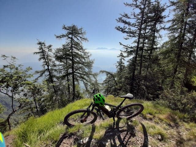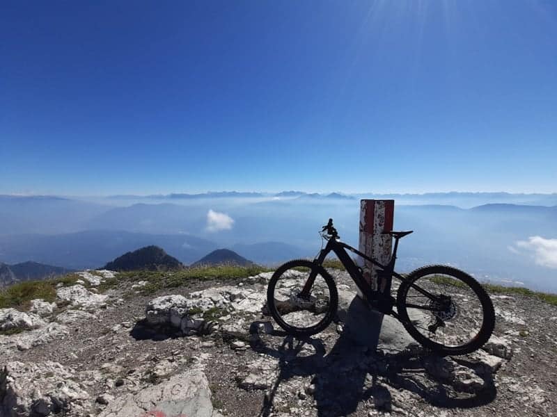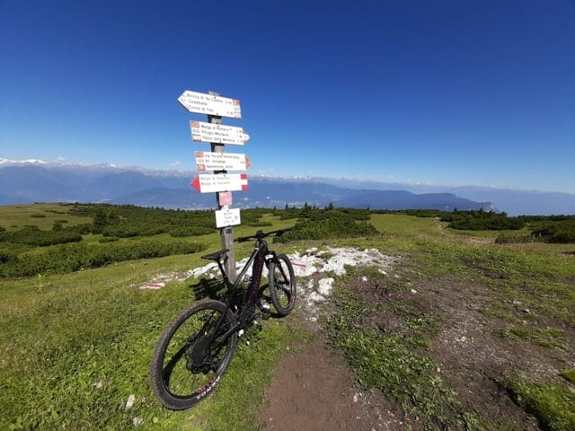 Intorno a me, la vista spazia a 360 gradi, Dolomiti di Brenta, Adamello Presanella, Vioz, Cevedale, le cime del meranese, tutte le Dolomiti, dallo Sciliar alla Marmolada, passando per il Catinaccio e fino alla val di Fassa. Lo sguardo corre da una cima all’altra nel tentativo di riconoscerle tutte e ripaga della fatica fatta per salire fino a qui. Si fatica, perché anche se uso una bici assistita, arrivare qui è impegnativo, richiede attenzione e un po’ di tecnica.