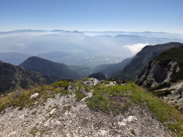 Qui bisogna decidere se continuare a salire fino alla cima del Roen o andare al rifugio Oltradige, poco lontano. Decido di salire … Da questo punto in avanti, la mia Bianchi t-tronik a pedalata assistita dà il meglio di sè. Le pendenze diventano davvero importanti e la strada presto si trasforma nel sentiero usato dalle mucche e dai pastori al seguito. Superato il limite dei 2.000 metri di altitudine, gli alberi scompaiono e rimangono i cespugli. Inizia ad aprirsi il panorama, qualche cima appare e scompare, come a giocare a nascondino. Alla fine anche i cespugli lasciano spazio alle distese erbose e la bellezza del panorama toglie più il fiato che la fatica. Ancora poche pedalate e finalmente siamo alla sommità del monte Roen, a 2.116 metri circa.