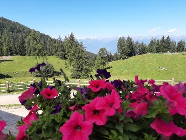 Riprendiamo la nostra pedalata e continuiamo a salire lungo la strada forestale che ci conduce prima a una fontana usata come abbeveratoio e da lì si arriva alla malga di Romeno. La sosta è obbligatoria, la vista spazia sulle cime più alte del Parco nazionale dello Stelvio, e contemporaneamente su tutte le prelibatezze che vengono preparate con ingredienti a chilometro zero.