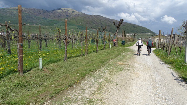 Dalla cima della collinetta, dopo aver reso omaggio ai nostri caduti e ammirato il panorama a 360 gradi che si ha, riprendiamo il nostro percorso salendo e scendendo per queste colline dalle pendenze molto importanti. Qui le nostre ebike, danno il meglio di sè e consentono a tutti di affrontare in completa tranquillità la giornata. Attraversare i vigneti ammirando da vicino il lavoro degli uomini, guardare i colori dei fiori, sentire il profumo dell’aria pulita, rendono ancora più piacevole sorseggiare il Cartizze.